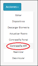 2.- En esta nueva ventana podremos filtrar al colaborador que deseemos que marque asistencia por la APP, para luego seleccionar el botón Acciones, donde seleccionaremos Contraseña APP.