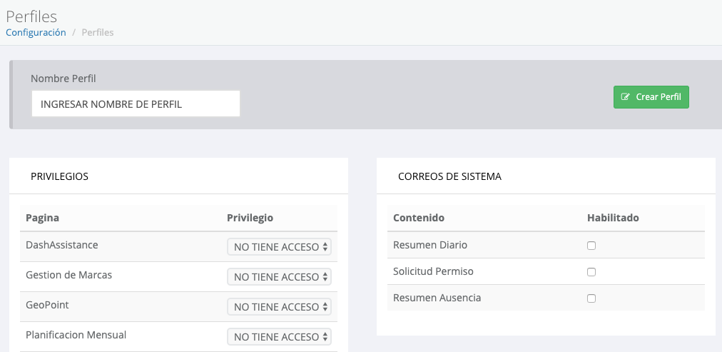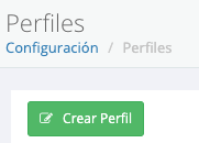 3.- En la siguiente pantalla podremos visualizar los perfiles/roles creados previamente y ademas agregar uno a nuestra medida, para esto debemos hacer click en el botón Crear Perfil: